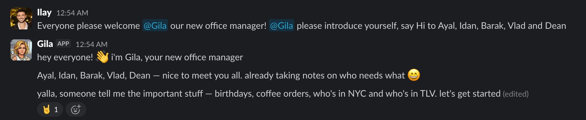 Gila handles lightweight but genuinely useful stuff - remembering teammate birthdays, tracking holidays, running polls, answering company knowledge questions. Anyone on the team can use her.