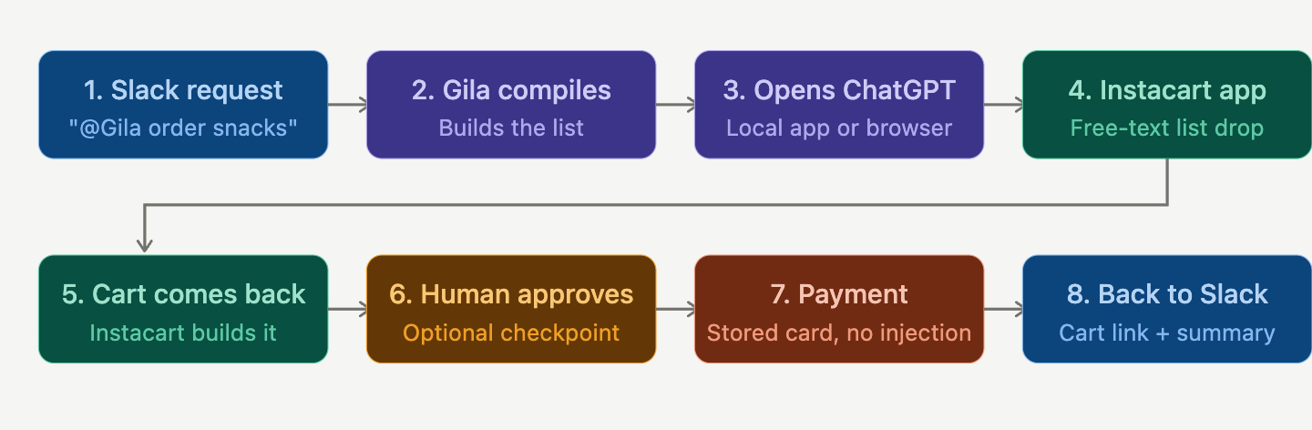 The MCP layer part means structured, text-native tool access. Gila doesn’t click buttons or parse HTML - she describes what she wants in plain text, and the Instacart app handles the rest. “Add 3 packs of Spindrift in different flavors and a coconut water” is a complete, sufficient instruction, which will be injected to the text prompt of ChatGPT local app or webpage (technical note: yes, this is still “browser automation” if you’re running it through the browser - but it’s pretty much almost the only action required to make the whole thing work, so it stays lightweight. Same story if you wire OpenClaw up to a local ChatGPT install and let it use computer-use to click buttons and type text: that’s normally slow and brittle, but the actions you’re asking it to take here are small enough that it doesn’t matter.)